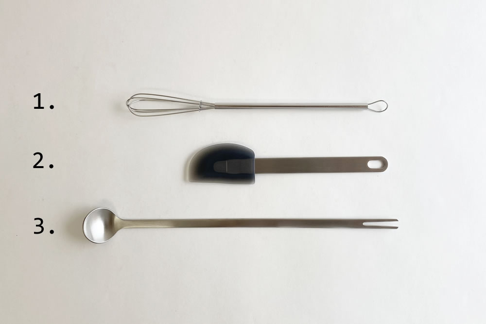- 「味見スプーン」これ一本でサラリと味見。味見用の小さなスプーンに、煮え具合をチェックするフォーク付き。長い柄は熱くなりにくいです。