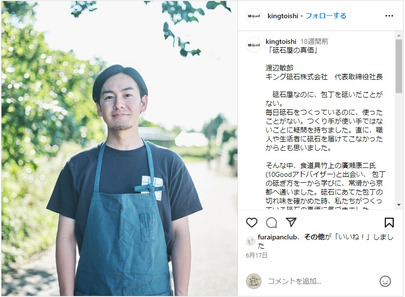そこで、昨秋に好評を博したキング砥石の渡辺社長をお招きして包丁の砥ぎ教室を開催いたします。 1940年創業のキング砥石は、やきものの街・常滑市でプロユースから家庭用まで多種多様の砥石を製造する老舗メーカーです。 只今、家庭向けの新たなブランディングを手掛けて10Goodシリーズが 発売されています。こちらで、お手元の包丁をご自身の手で復活させましょう。