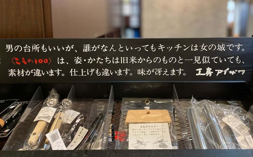 当社実店舗には、アイザワさんの黒塗りの木製什器が25年以上使われています。 そこには、「男の台所もいいが、誰がなんといってもキッチンは女の城です。」 一昔前の女性の強い意思、責任感および使命感を感じることができます。 「女の城」という表現は、台所を守る、それが家庭を守ることに通じる真剣勝負なのでしょう。 時代が置き去りにしてしまった、古き良きものの一つのように感じます。